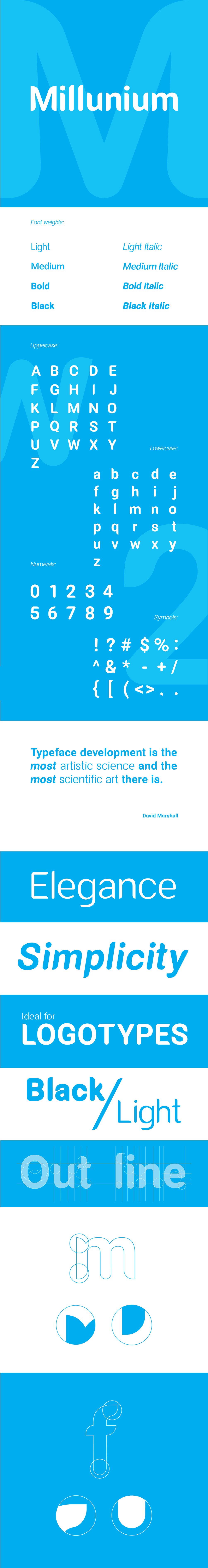 Millunium typeface is a modern sans serif font that is finely made to catch up the current design trend. It comes in 4 weights (Light, Normal, Bold, Black) and 4 italics. Millunium can always be use in a wide range of project; it looks marvelous as logotype, looks well as body type, perfect for poster design, apparel and so much more!